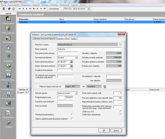 - Agenda eviduje, pre osoby zamestnancov, jednotlivé exekučné prípady - prednostné, neprednostné zrážky, výživné, dlžné výživné, pokuty, daňové exekúcie a ďalšie.