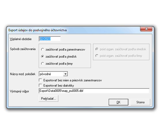 Po nadefinovaní vzorových účtov (pre podvojné účtovníctvo) a nadefinovaní kódov (pre jednoduché účtovníctvo) môžete vyexportovať mzdové údaje za zadané výplatné obdobie. Zaúčtovanie do denníka je možné zvoliť podľa firmy, stredísk, alebo podľa zamestnancov.Exportom je vytvorený súbor, z ktorého potom jednoduchým spôsobom zaúčtujete mzdové položky do účtovného, alebo peňažného denníka.